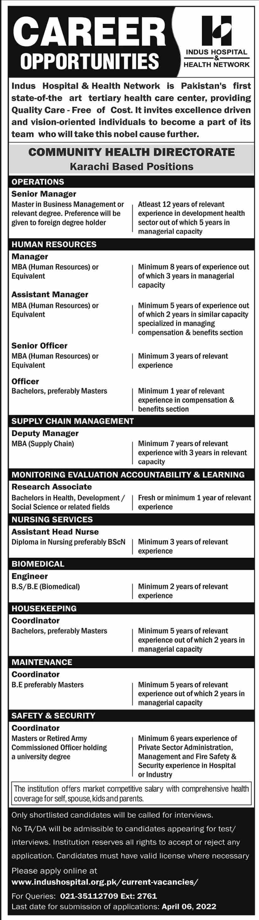 The Indus Hospital Karachi, karachi Sindh Pakistan invites applications from eligible candidates for the post of assistant manager, assistant head nurse, engineer, coordinator, manager, research associate, officer and deputy maanger as per advertisement of March 27, 2022 published in daily Dawn Newspaper. Master and Bachelor etc. educational qualification will be preferred.