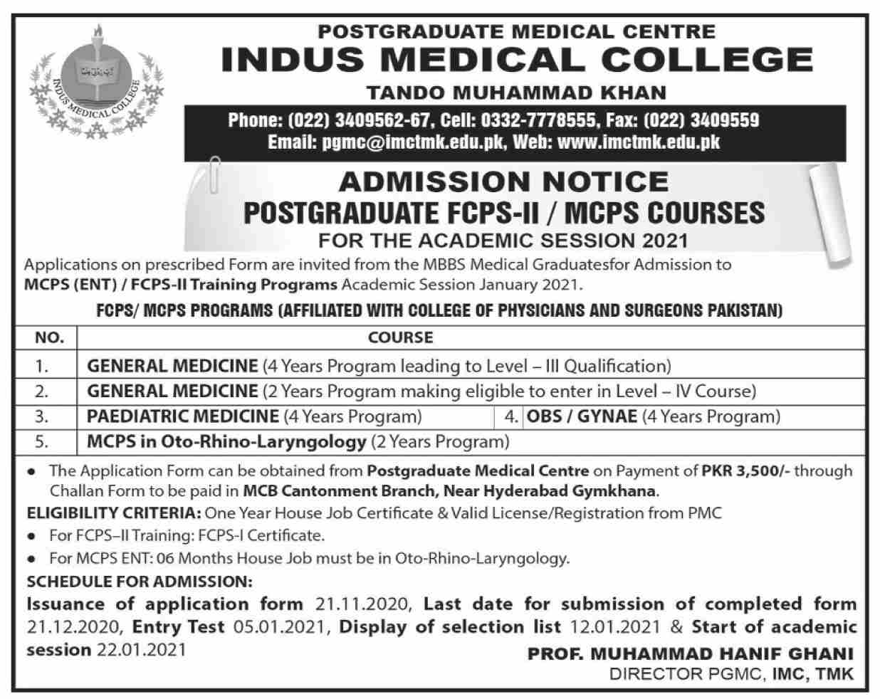 Postgraduate Medical Centre Indus Medical College is offering admissions for postgraduate FCPS-II / MCPS Courses in General Medicine, Paediatric Medicine in Tando Muhammad Khan. Read newspaper ad for exact details.