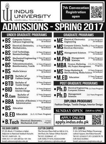 Indus University Admission in BS, ME, MS, MBA and Mphill in karachi. Read newspaper ad for exact details.