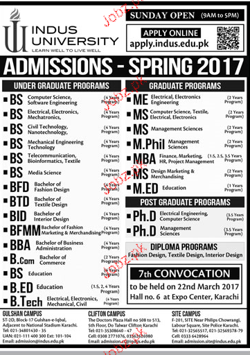 Indus University Admission in BS, ME, MS, MBA and Mphill in Karachi. Read newspaper ad for exact details.