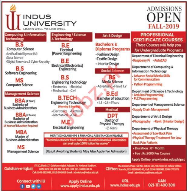 Indus University has announced admissions in BS Computer Science, Software Engineering, MS Computer Science, BBA, MBA, MS Management Sciences, b.E Electrical Engineering, B.S Engineering Technology in Electrical, Electronics, Mechanical, Civil, B.Tech, M.E Electrical Engineering, BS Media Sciences, B.Ed, Doctor of Physical Therapy DPT in Karachi. Read newspaper ad for exact details.