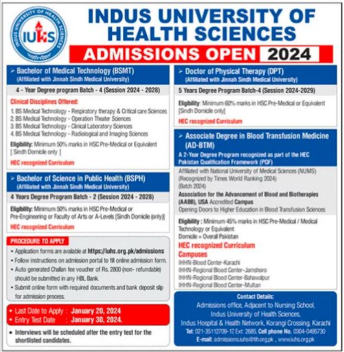 Indus University admissions 2023 for BS Medical Technology, DPT, ADBTM, Associate Degree Bllof Transfusion Medicine, Bachelor of Science in Public Health BSPH has been announced. Eligible students can apply for academic admissions 2023 in Indus University Karachi Sindh Pakistan for Science University. Students who want to enroll for academic session 2023 in BS and ADP qualification and admission criteria for Private institute can apply till last date 20 January 2024. Read newspaper ad for exact details.