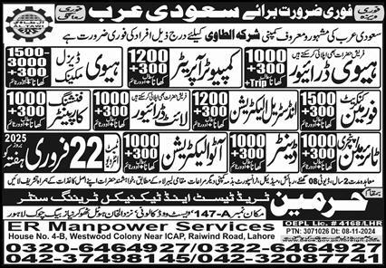 Vacant posts including tyre man, heavy diesel mechanic, heavy driver, htv driver, computer operator, finishing carpenter, industrial electrician, driver, light driver, denter, auto electrician and concrete foreman are announced in Harmain Trade Test & Technical Training Center Riyadh, tabuk Saudi Arabia as per 20 February 2025 advertisement in daily Express Newspaper. Candidates with Matric, DAE, Intermediate and Bachelor etc. educational background will be preferred.