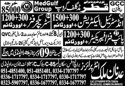 Vacant posts including industrial electrician, fabricator, pipe fitter and structure fitter are announced in Adnan Malik Enterprises Qatar, qatar Qatar as per 8 November 2022 advertisement in daily Express Newspaper. Educational qualifications required Matric and Intermediate etc.