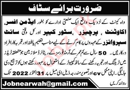 Industrial Group jobs advertisement dated about 23 October 2022 in daily Express Newspaper invites application for the vacant post of site supervisor, purchaser, admin officer, accountant and store keeper in Wah Cantt, wah cantt Punjab Pakistan. Persons with Bachelor and Intermediate etc. education can apply.