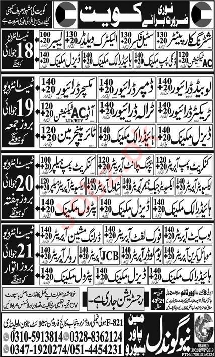 Vacant posts including steel fixer, mechanic, diesel mechanic, donkey pump mechanic, electric welder, auto ac technician, labor, hydraulic mechanic, ac technician, concrete pump operator, shuttering carpenter, driver and tyre puncture man are announced in New Gondal Manpower Bureau Kuwait, kuwait Kuwait as per 14 July 2024 advertisement in daily Express Newspaper. Preferred Education is Middle, Primary, Matric and DAE etc.