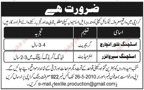 Apply as per details in job advertisement. Login to view further details of how to apply via https://www.jobz.pk online.
