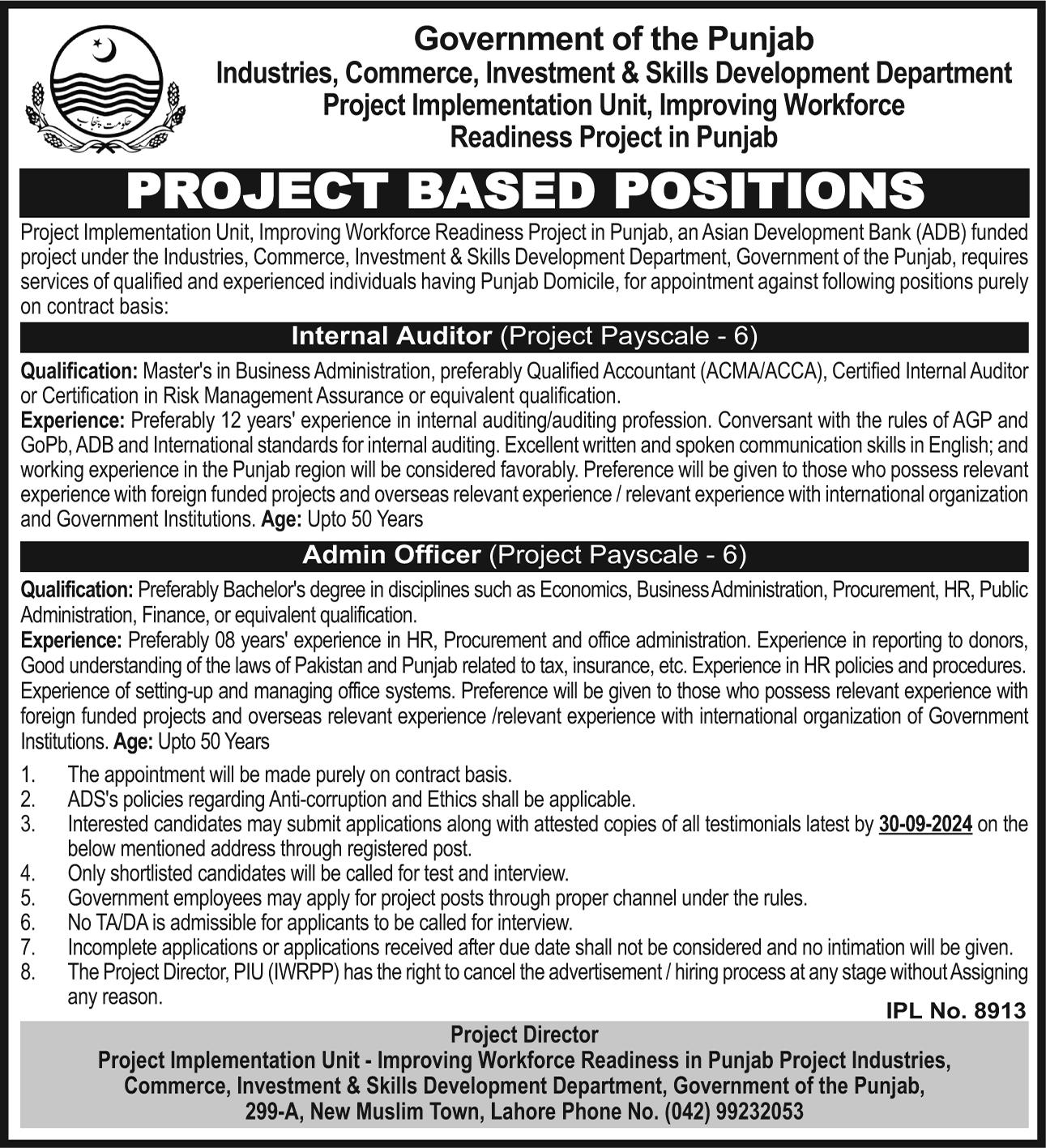 Industries Commerce & Investment Department jobs advertisement dated about 19 September 2024 in daily Other Newspaper invites application for the vacant post of admin officer and internal auditor in Lahore, lahore Punjab Pakistan. Educational qualifications required Master and Bachelor etc.