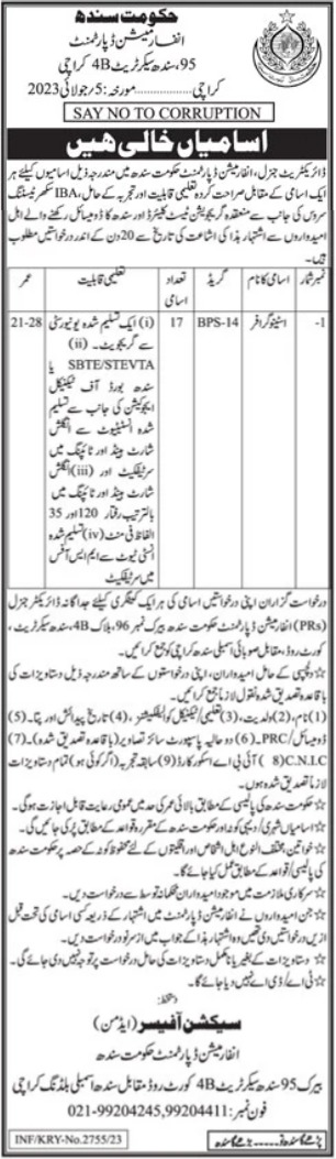 Vacant posts including stenographer are announced in Information Department Karachi, karachi Sindh Pakistan as per 6 July 2023 advertisement in daily Jang Newspaper. Candidates with Bachelor etc. educational background will be preferred.