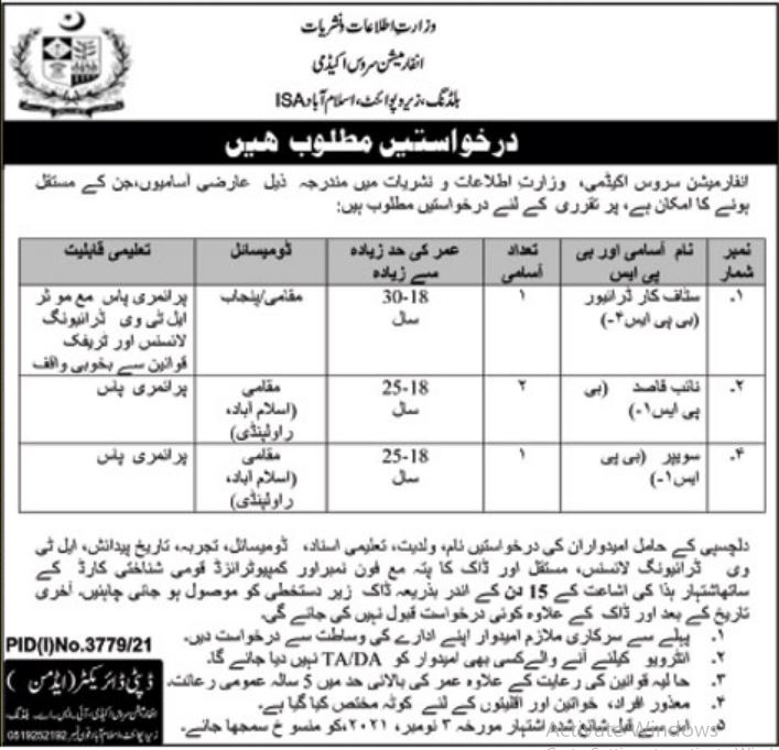 Information Service Academy Driver Naib Qasid & Sweeper Jobs