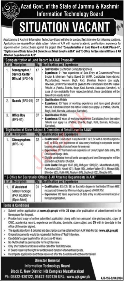Information Technology Board invites applications for job positions advertised in daily Nawaiwaqt dated 8 April 2024 for following vacancies in Muzaffarabad, muzaffarabad AJK Pakistan.