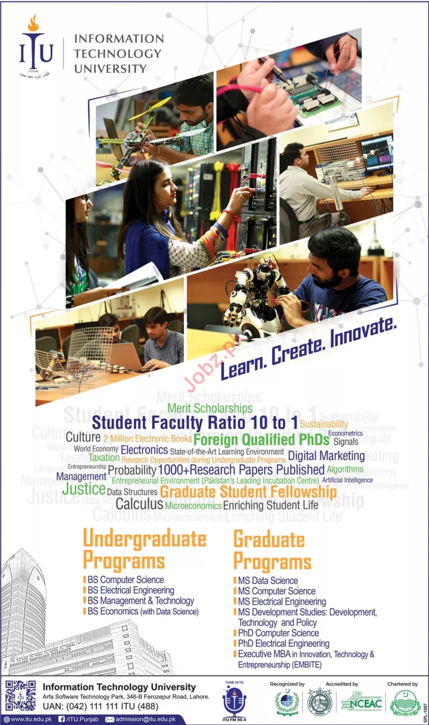 Information Technology University ITS has announced admissions in BS Computer Science, BS Electrical Engineering, BS Management and Technology, BS Economics, MA Date Science, MS Computer Science, MS Electrical Engineering, MS Development Studies, PhD Computer Science, PhD Electrical Engineering, Executive MBA in Lahore. Read newspaper ad for exact details.