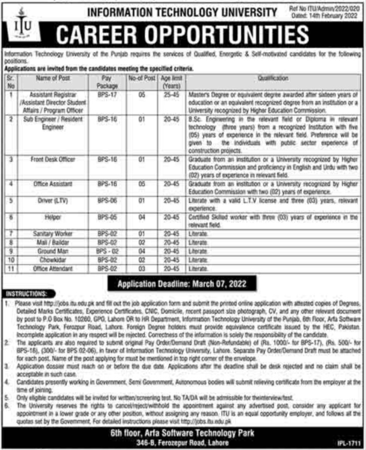 Latest Government jobs in Information Technology University ITU in Education and others can be applied till 7 March 2022 or as per closing date in newspaper ad. Read complete ad online to know how to apply on latest Information Technology University ITU job opportunities.