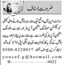Vacant posts including blowing machine operator, machine operator and injection molding machine operator are announced in Manufacturing Company Karachi, karachi Sindh Pakistan as per 4 October 2025 advertisement in daily Dunya Newspaper. Preferred Education is DAE, Intermediate and Matric etc.