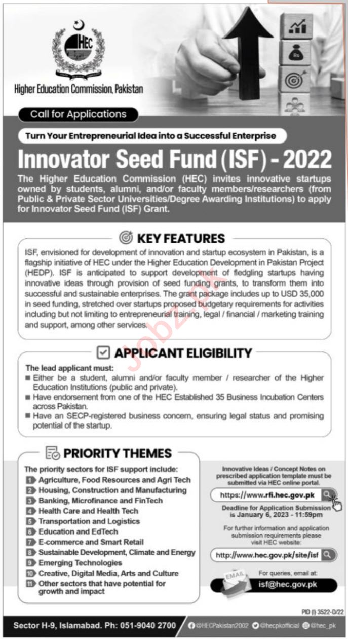 Higher Education Commission HEC Islamabad, islamabad Islamabad Pakistan invites applications from eligible candidates for the post of innovator seed fund as per advertisement of December 4, 2022 published in daily Nation Newspaper. Educational qualifications required Bachelor and Master etc.