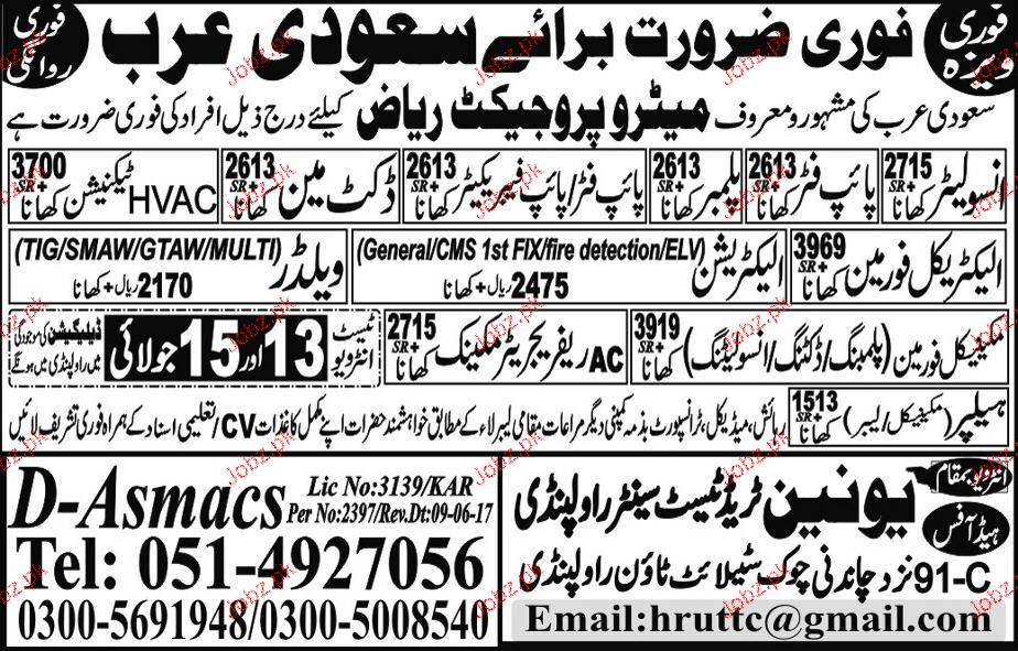 Insolators, Pipe Fitters, Pipe Fabricators, Ductman, HVAC Technicians, Mechanical Foreman, Electricians and Welders are required in Saudi Arabia. Union Trade Test Center.
