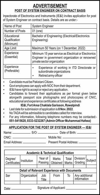 Pakistan Army, Inspectorate of Electronics and Instrumentation Fort Area Rawalpindi, rawalpindi Punjab Pakistan invites applications from eligible candidates for the post of system engineer as per advertisement of November 1, 2022 published in daily Express Newspaper. Educational qualifications required Bachelor and B.E etc.