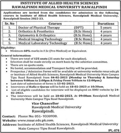 Rawalpindi Medical University RMU Doctor of Physics Therapy, DPT, BSc Hons, BSc Medical Laboratory Technology, admissions 2023 has been started. Students who want to take admissions in Rawalpindi Medical University RMU Rawalpindi Punjab Pakistan for academic year 2023 to continue education in Science University can apply. Eligible candidates for admissions in DPT and BSc Hons can apply as per Government institute criteria and before closing date 4 February 2023 after reading advertisement online. Read newspaper ad for exact details.