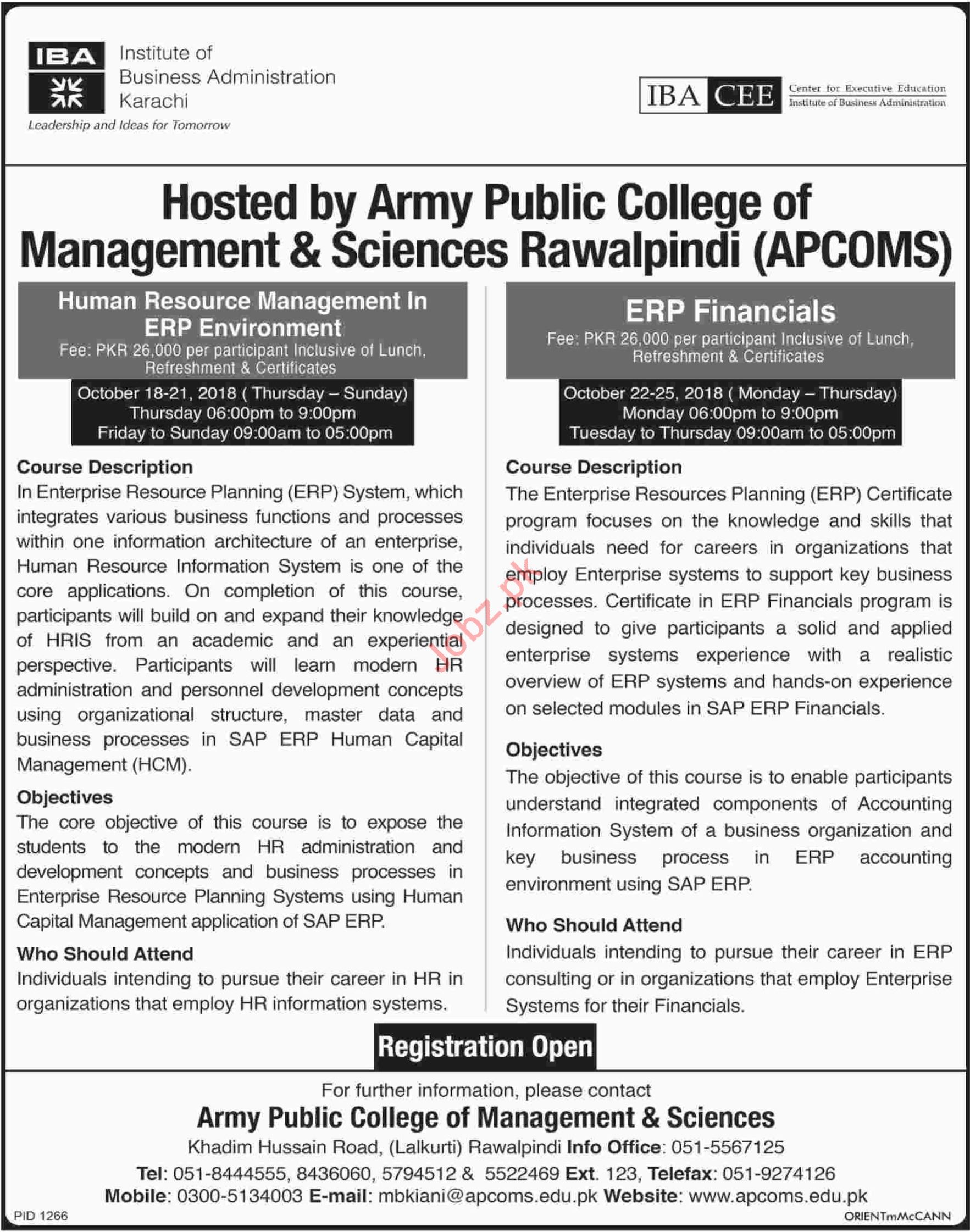 Institute of Business Administration IBA hosted by Army Public College of Management Sciences APCOMS in Rawalpindi offers courses in Human Resource Management in ERP Environment & ERP Financials 2018. Read newspaper ad for exact details.