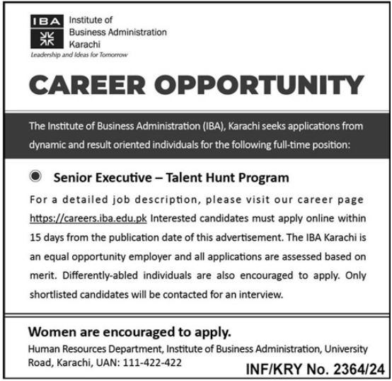 Institute of Business Administration IBA jobs advertisement dated about 29 July 2024 in daily Kawish Newspaper invites application for the vacant post of executive and executive talent hunt program in Karachi, karachi Sindh Pakistan. Candidates with Master etc. educational background will be preferred.