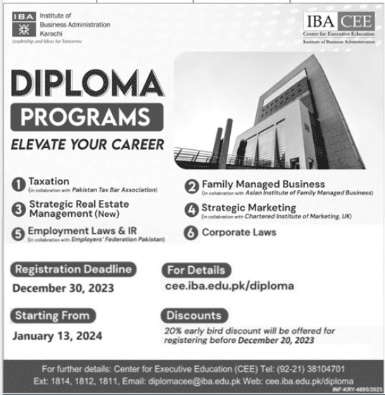Institute of Business Administration IBA Diploma Programs in Taxation, Strategic Real Estate Management, Employment Law & HR, Family Managed Business, Strategic Marketing, Corporate Laws admissions 2023 has been started. Eligible students who qualify as per admission criteria in Institute of Business Administration IBA Karachi Sindh Pakistan can apply in Management Course for academic year 2023. Students for admissions in Diploma and Course & criteria can apply as per Government institute admission policy 2023 before closing date December 30, 2023 as per advertisement. Read newspaper ad for exact details.