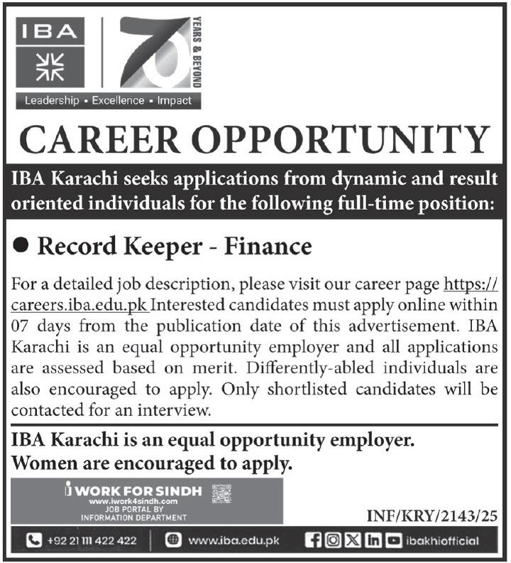 Institute of Business Administration IBA jobs advertisement dated about 6 July 2025 in daily Express Tribune Newspaper invites application for the vacant post of record keeper in Karachi, karachi Sindh Pakistan. Educational qualifications required Bachelor and Master etc.