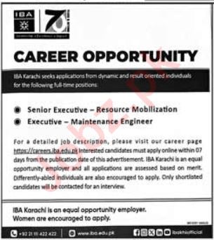 Vacant posts including executive resource mobilization and executive maintenance engineer are announced in Institute of Business Administration IBA Karachi, karachi Sindh Pakistan as per 18 May 2025 advertisement in daily Jang Newspaper. Candidates with Bachelor and Master etc. educational background will be preferred.