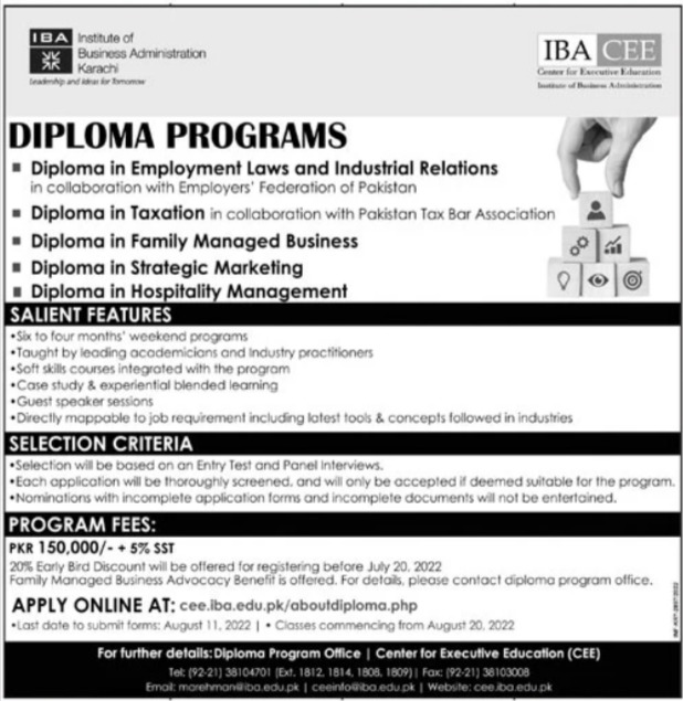 Institute of Business Administration IBA Diploma Programs in Employment Laws & Industrial Relations, Taxation, Family Managed Business, Strategic Marketing, Hospitality Management admissions 2022 has been announced. Institute of Business Administration IBA Karachi Sindh Pakistan welcomes students to apply for admissions in academic year 2022 in Business Diploma. Eligible students for fulfilling criteria for admissions in Diploma can enroll as per Government admission policy 2022 till closing date 20 July 2022. Read newspaper ad for exact details.