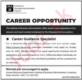 Institute of Business Administration IBA Karachi, karachi Sindh Pakistan invites applications from eligible candidates for the post of career guidance specialist as per advertisement of June 9, 2024 published in daily Jang Newspaper. Bachelor etc. educational qualification will be preferred.