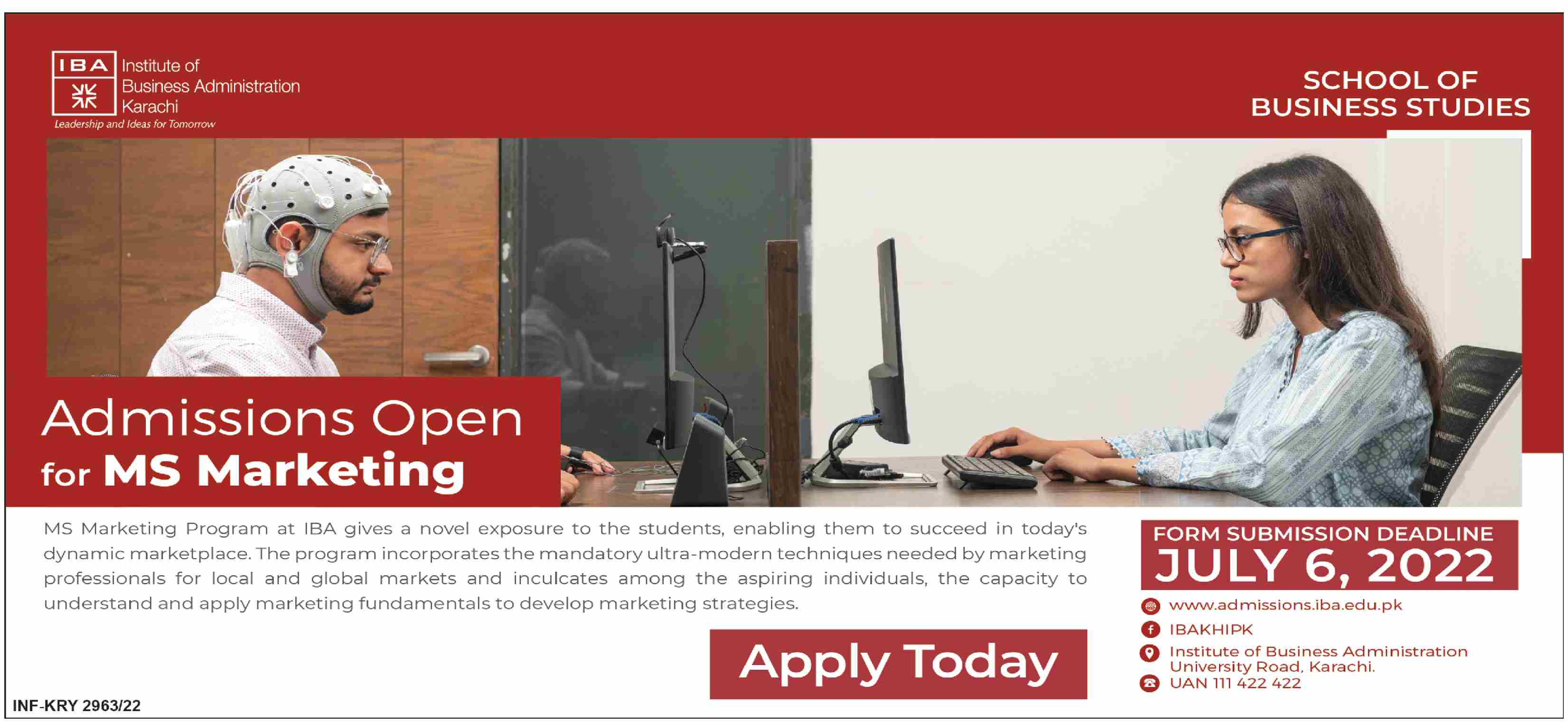 Institute of Business Administration IBA MS in Marketing admissions 2022 has been started. Students who want to take admissions in Institute of Business Administration IBA Karachi Sindh Pakistan for academic year 2022 to continue education in Marketing Sales MS can apply. Students for admissions in MS & criteria can apply as per Government institute admission policy 2022 before closing date July 6, 2022 as per advertisement. Read newspaper ad for exact details.