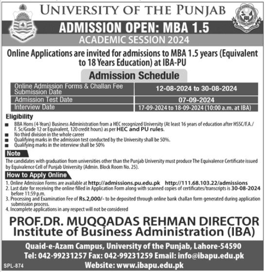 Institute of Business Administration University of the Punjab PU admissions 2024 for Master of Business Administration has been announced. Eligible students can apply for academic admissions 2024 in University Of The Punjab PU Lahore Punjab Pakistan for Management University. Students for admissions in MBA & criteria can apply as per Government institute admission policy 2024 before closing date August 30, 2024 as per advertisement. Read newspaper ad for exact details.