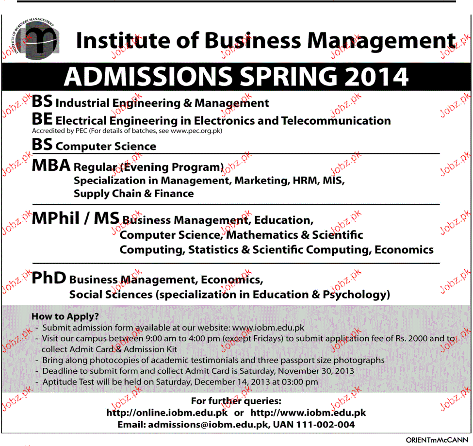 Institute of Business management Admission in BS, BE, MBA, Mphill and phd in Lahore Read newspaper ad for exact details.