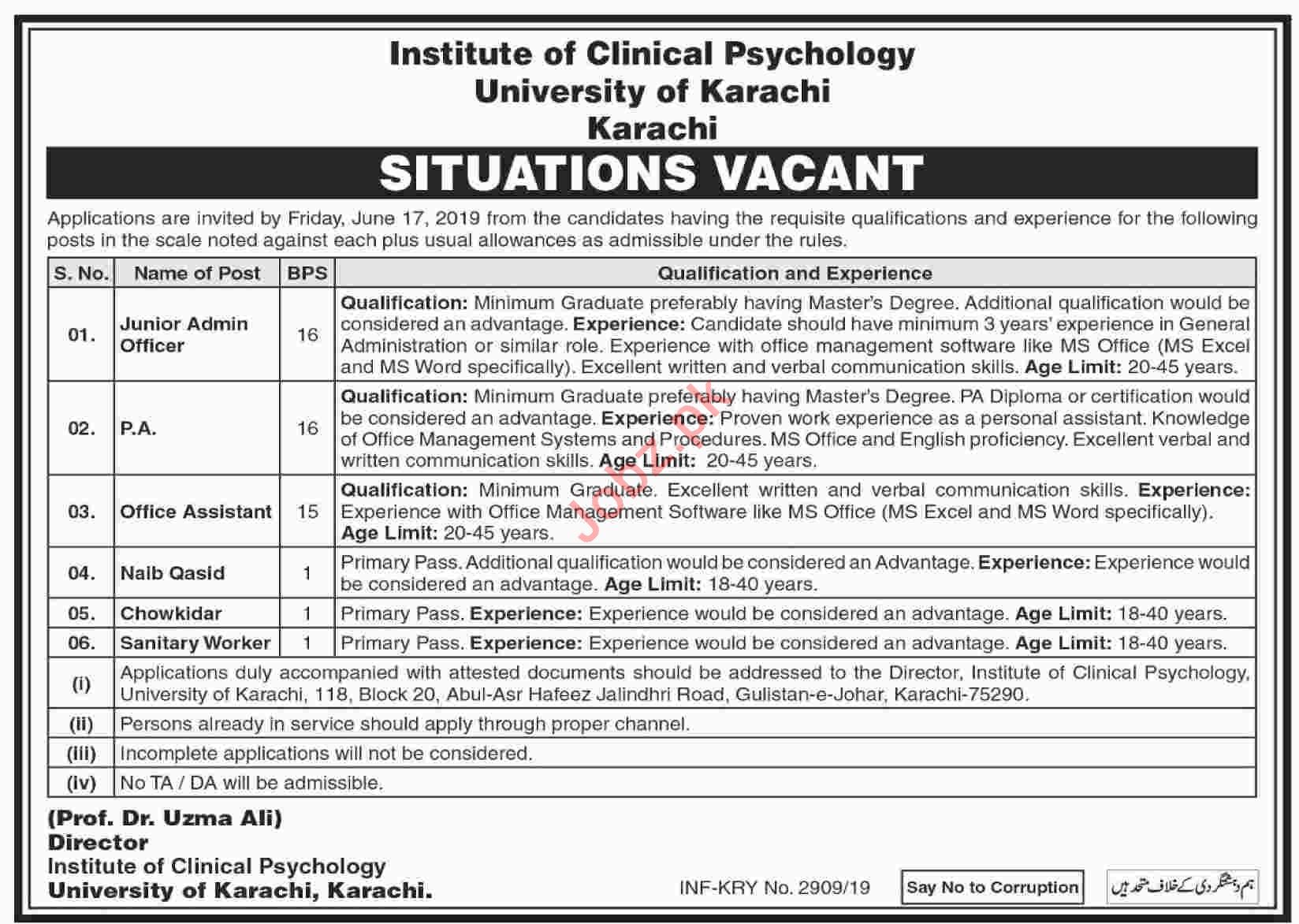 Institute Of Clinical Psychology UOK Karachi Jobs 2019