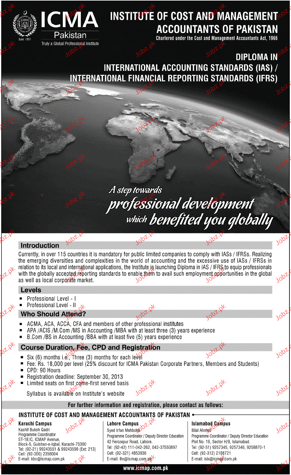 Institute of Cost and Management Accountants of Pakistan in Diploma in Accounting in Islamabad Read newspaper ad for exact details.