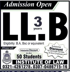 Institute of Law Admission in LLB in Lahore. Read newspaper ad for exact details.