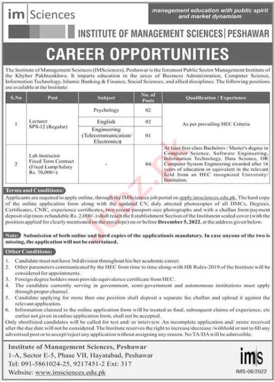 Institute of Management Sciences Peshawar, peshawar Khyber Pakhtunkhwa KPK Pakistan invites applications from eligible candidates for the post of lecturer and lab instructor as per advertisement of November 20, 2022 published in daily The News Newspaper. Persons with Master and Bachelor etc. education can apply.