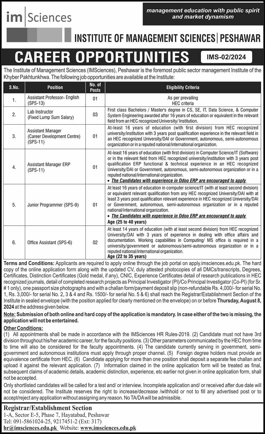 Institute of Management Sciences Peshawar, peshawar Khyber Pakhtunkhwa KPK Pakistan invites applications from eligible candidates for the post of assistant professor, programmer, assistant manager, office assistant and lab instructor as per advertisement of July 25, 2024 published in daily Express Newspaper. Candidates with MCS, MS, Bachelor, BCS and Master etc. educational background will be preferred.
