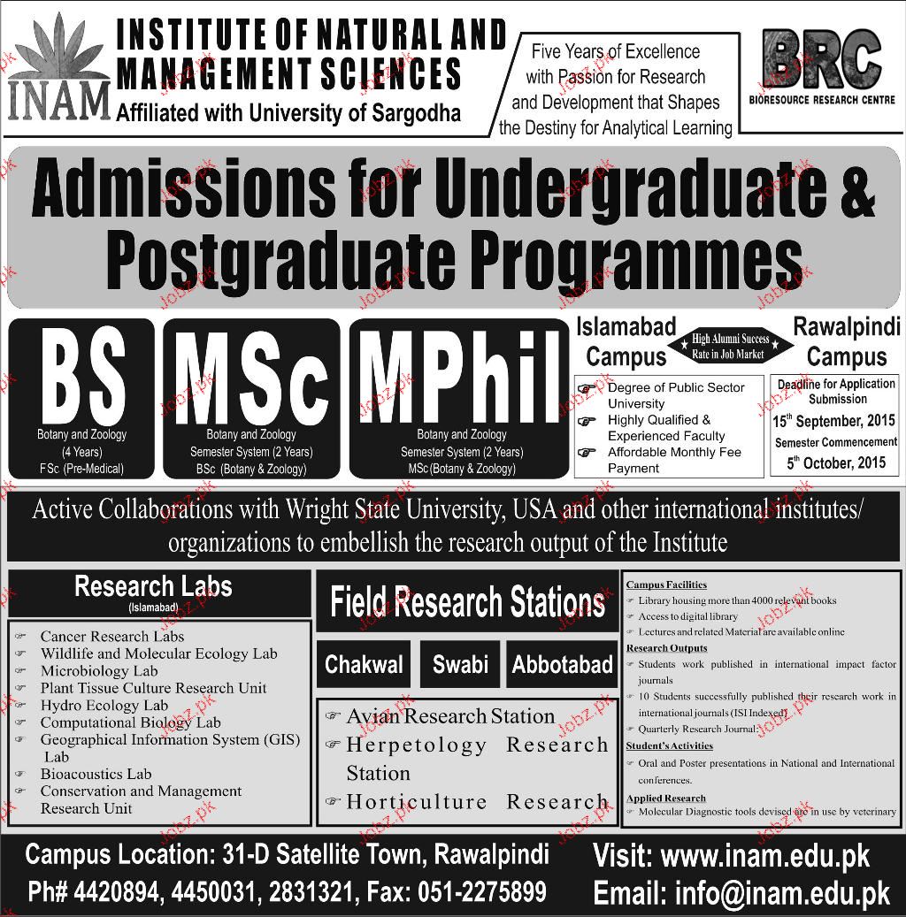 Institute of Natural and Management Sciences Admission in BS, MSc and Mphill in Rawalpinid. Read newspaper ad for exact details.