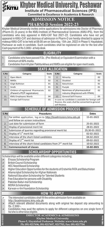 Institute of Pharmaceutical Sciences IPS, Khyber Medical University has announced admissions 2022 for Pharm D. Eligible students who qualify as per admission criteria in Khyber Medical University Peshawar Khyber Pakhtunkhwa KPK Pakistan can apply in Medical University for academic year 2022. Students who want to enroll for academic session 2022 in Pharm D qualification and admission criteria for Government institute can apply till last date. Read newspaper ad for exact details.