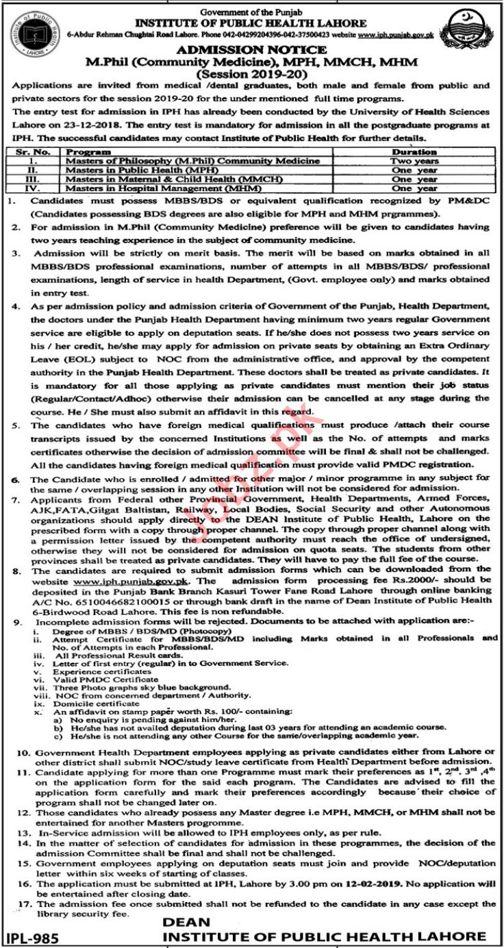 Government of The Punjab Institute of Public Health offers admissions for Masters of Philosophy M.Phil, Masters in Public Health MPH, Masters in Maternal & Child Health MMCH & Masters in Hospital Management MHM in Lahore. Read newspaper ad for exact details.
