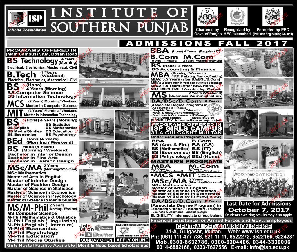 Institute of Southern Punjab Admission in BBA, BS and MBA in Multan. Read newspaper ad for exact details.