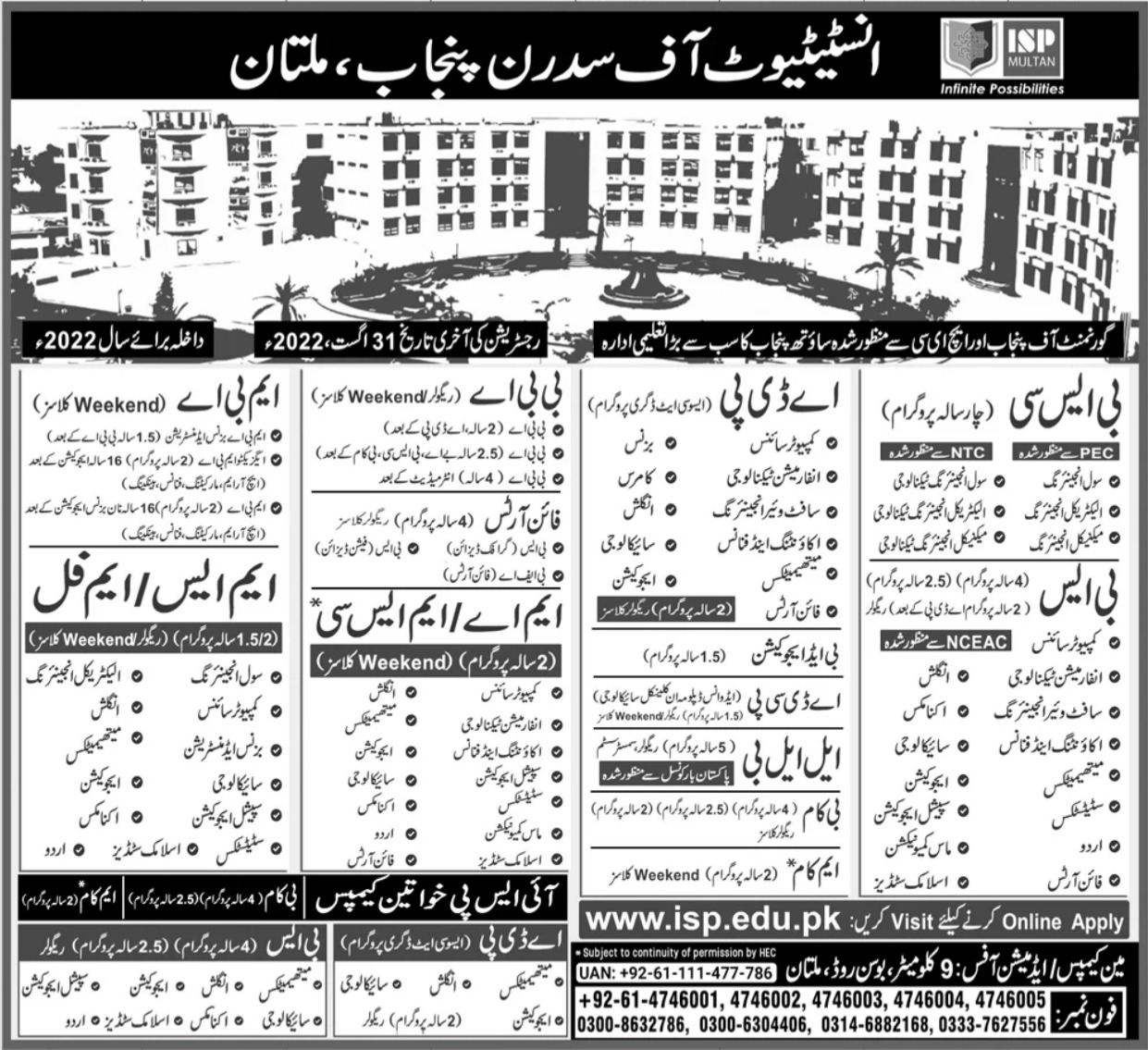 Institute of Southern Punjab ISP has announced admissions 2022 for Bachelor Degree in Civil Engineering, Electrical Engineering, Mechanical Engineering, Computer Science, Information Technology, Software Engineering, Accounting and Finance, Mathematics, Statistics, Urdu, Fine Arts, English Economics, Psychology, Education, Special Education, Mass Communication, islamic Studies. ADP Program in Computer Science, Information Technology, Software Engineering, Accounting and Finance, Mathematics, Fine Arts, Business, Commerce, English, Psychology, Educcation. LLB, B.Com, M.Com. Bachelor of Business Administration BBA. MS Computer Science, MBA, MPhil English.. Eligible students can apply for academic admissions 2022 in Institute of Southern Punjab ISP Multan Punjab Pakistan for Teaching College. Eligible candidates for admissions in MA, LLb, Mphil, Master, M.sc, BBA, MBA, MS, Bachelor and B.E can apply as per Private institute criteria and before closing date 26 September 2022 after reading advertisement online. Read newspaper ad for exact details.