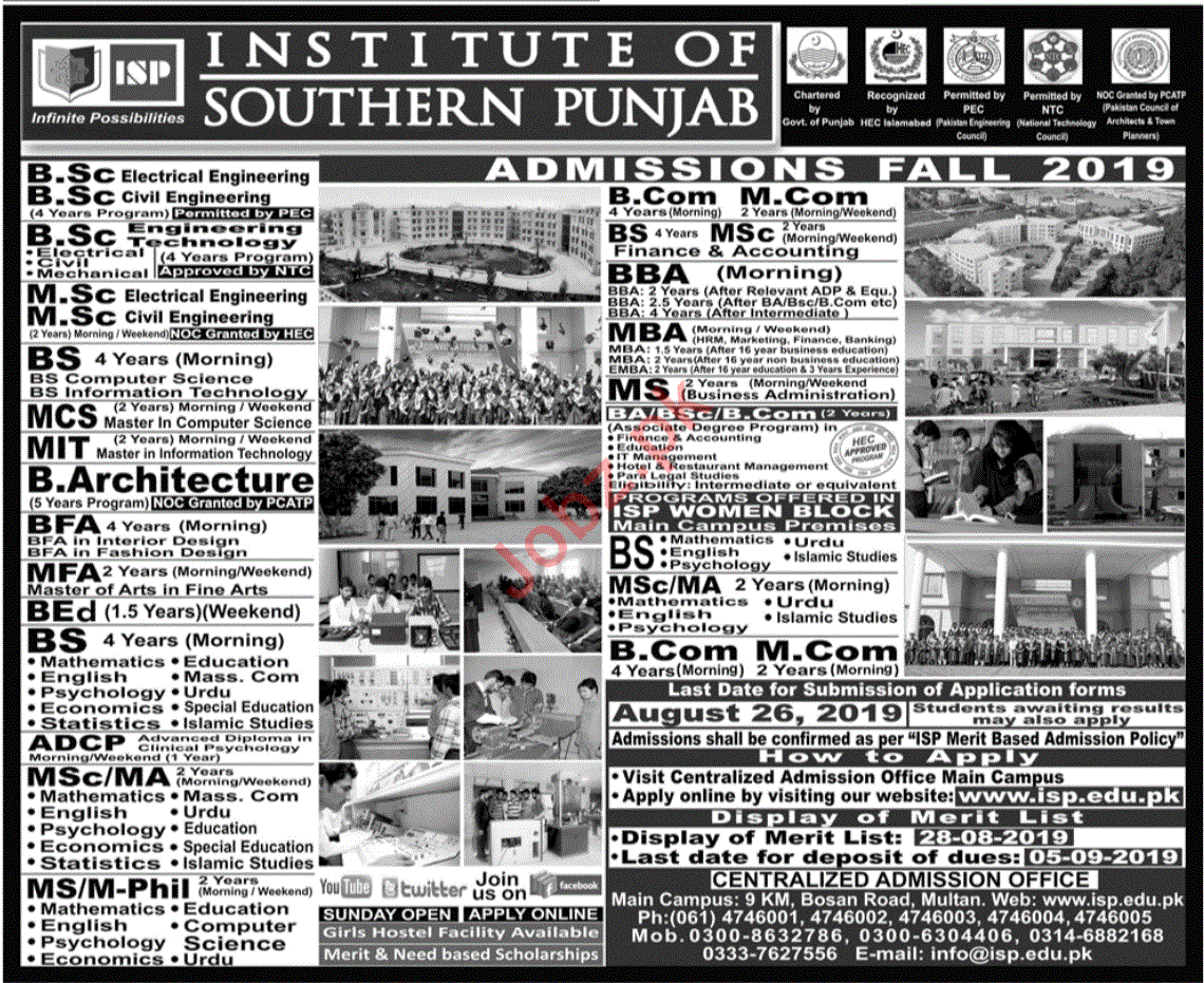 Institute of Southern Punjab ISP Multan, Pakistan are started admissions fall 2019 for the classes of BSc, MSc, BS, B Com, M Com, BBA, MBA, MS, BFA, MFA, M Phil and PhD. Read newspaper ad for exact details.