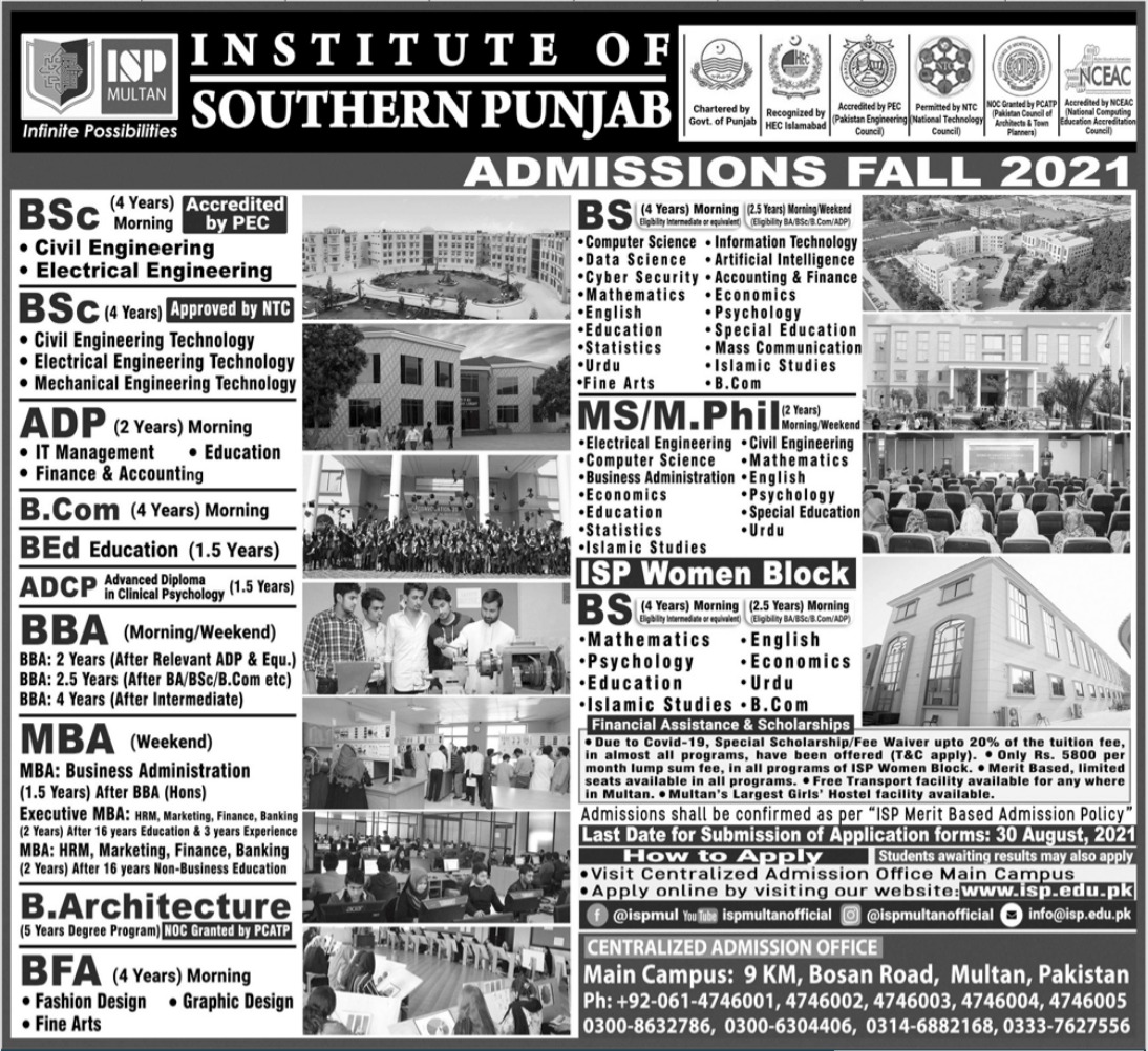 Institute of Southern Punjab ISP is a private sector university invites applications for admissions in BSc, ADP, B-Com, B.Ed, ADCP, MBA, BFA, BS, MS and M.Phil degree programs 2021. Read newspaper ad for exact details.