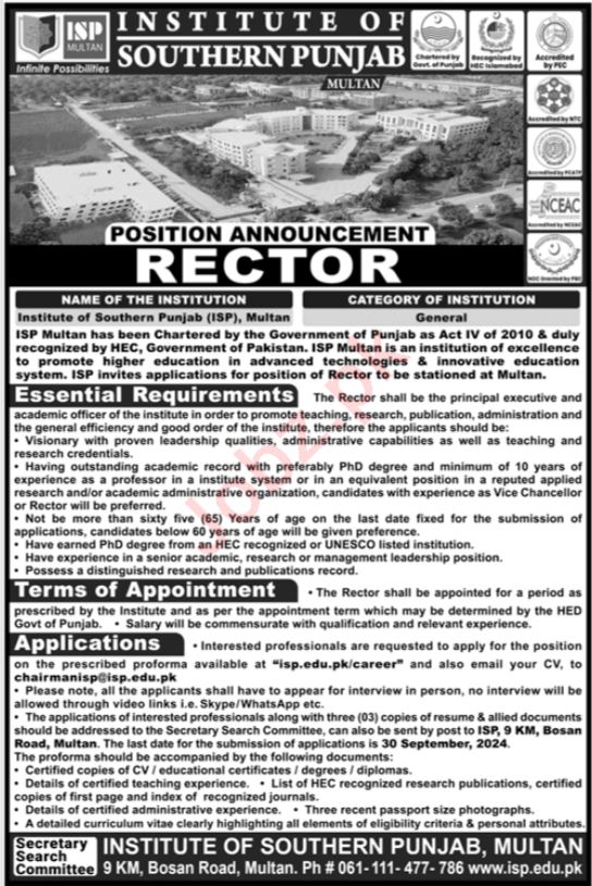 Institute of Southern Punjab ISP latest Private Education jobs and others can be applied till 30 September 2024 or as per closing date in newspaper ad. Read complete ad online to know how to apply on latest Institute of Southern Punjab ISP job opportunities.
