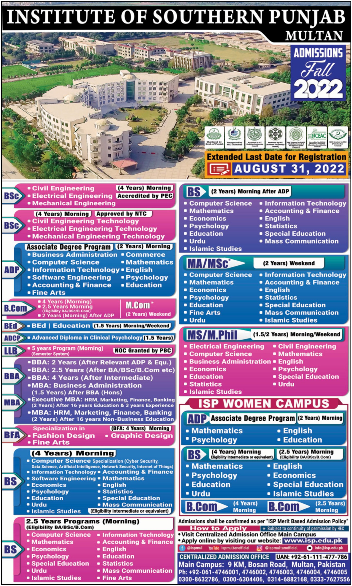 Institute of Southern Punjab Multan BS MS MPhil Admissions 2022