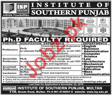 Vacancies in Institute of Southern Punjab ISP Advertisement November 2018