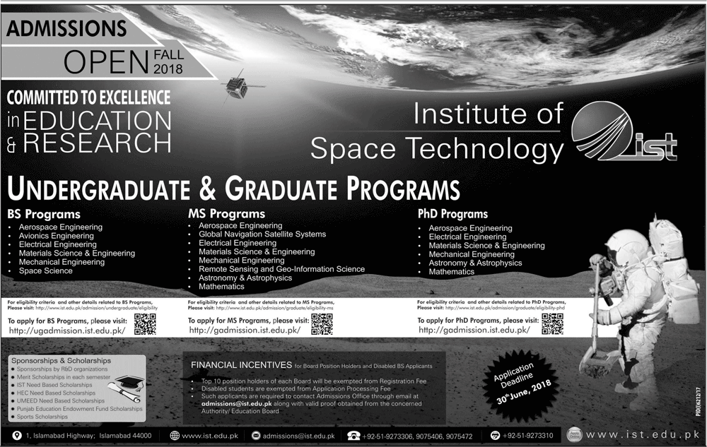 Institute of Space Technology IST Admission in Undergraduate Programs and Graduate Programs in Islamabad. Admission Open fall 2018. Admission Open for Both Male / Female Students Read newspaper ad for exact details.