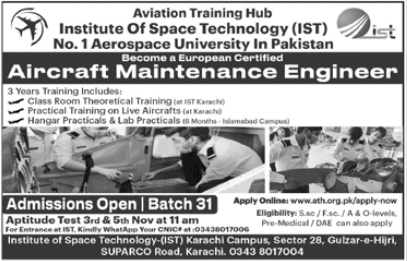 Aviation Training Hub Institute of Space Technology IST No 1 Aerospace University in Pakistan has announced admission for diploma in Aircraft Maintenance Engineer in Karachi. Read newspaper ad for exact details.