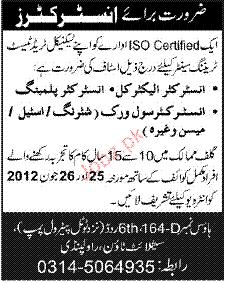 Instructor Electrical, Instructor Plumbing Job Opportunity